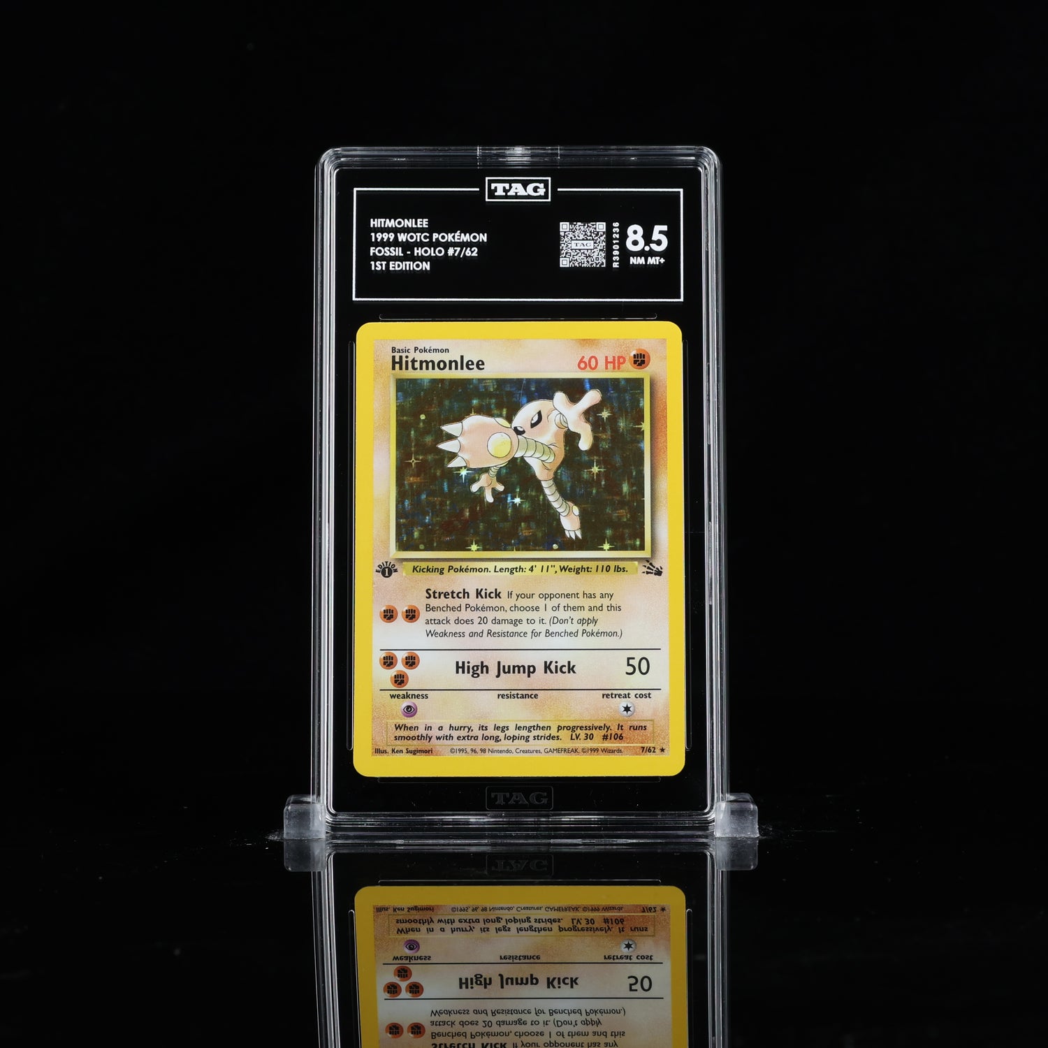 1999 POKEMON FOSSIL 1ST EDITION #7 HITMONLEE-HOLO TAG 8.5